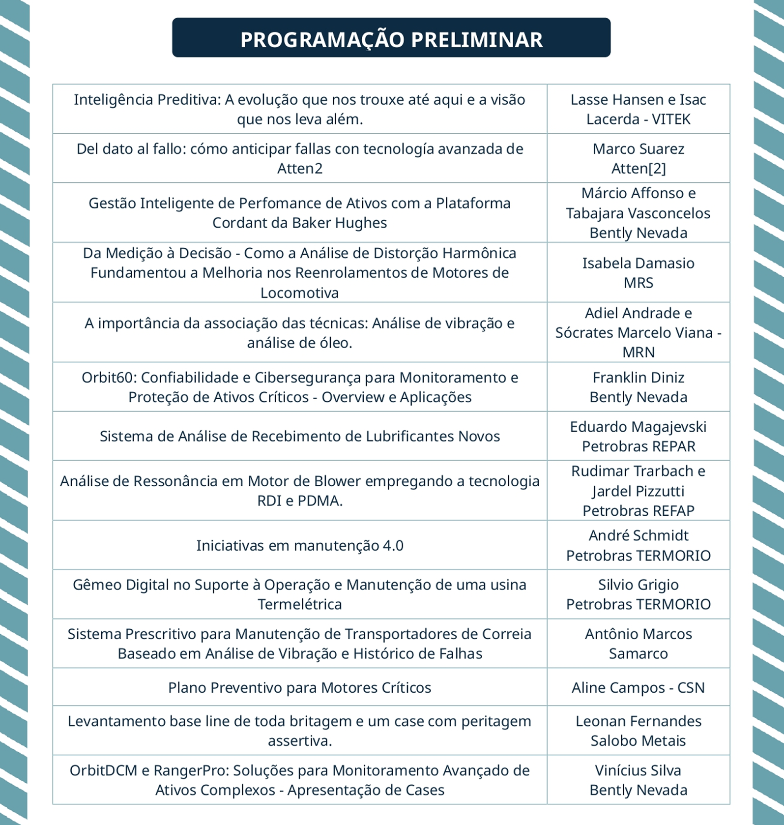 •Integração de tecnologias preditivas (vibração, elétrica e lubrificação)